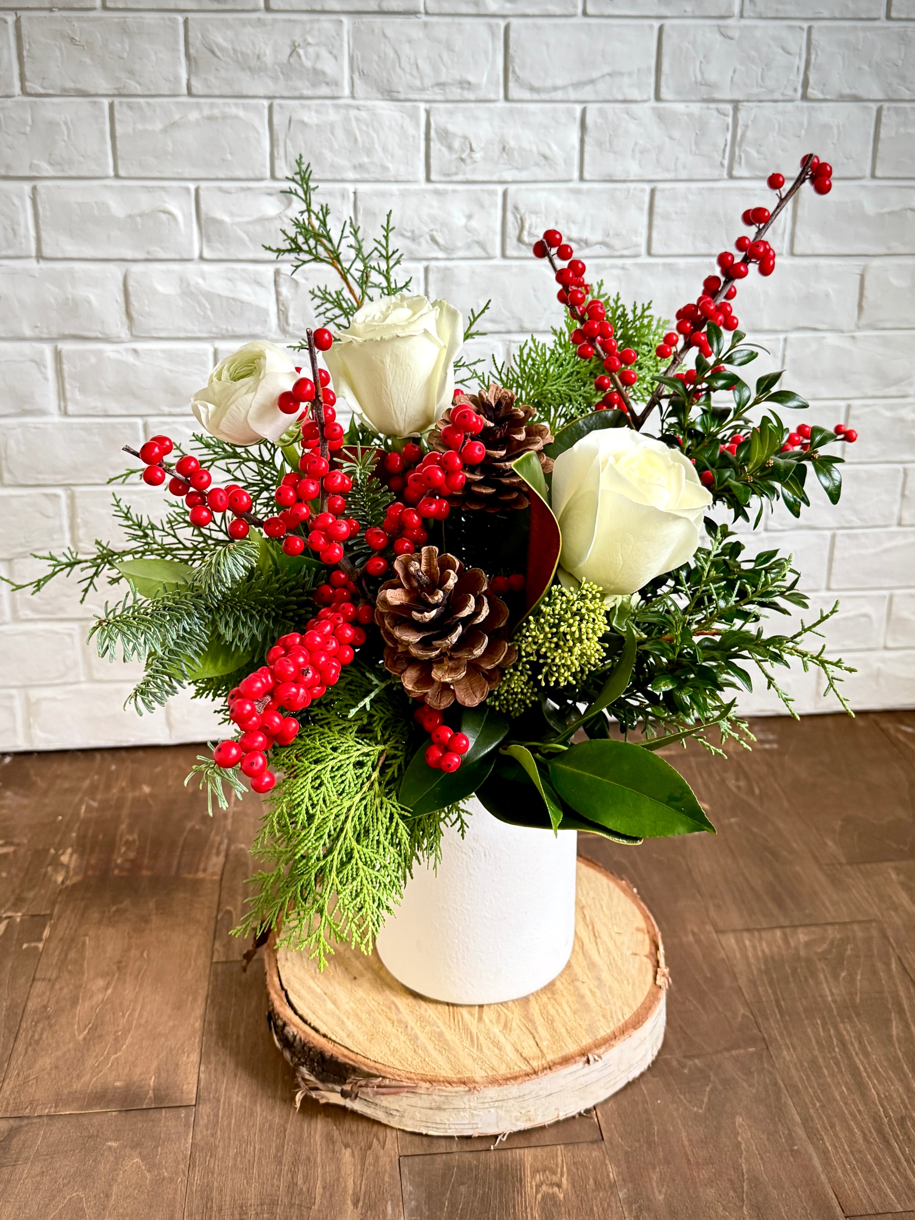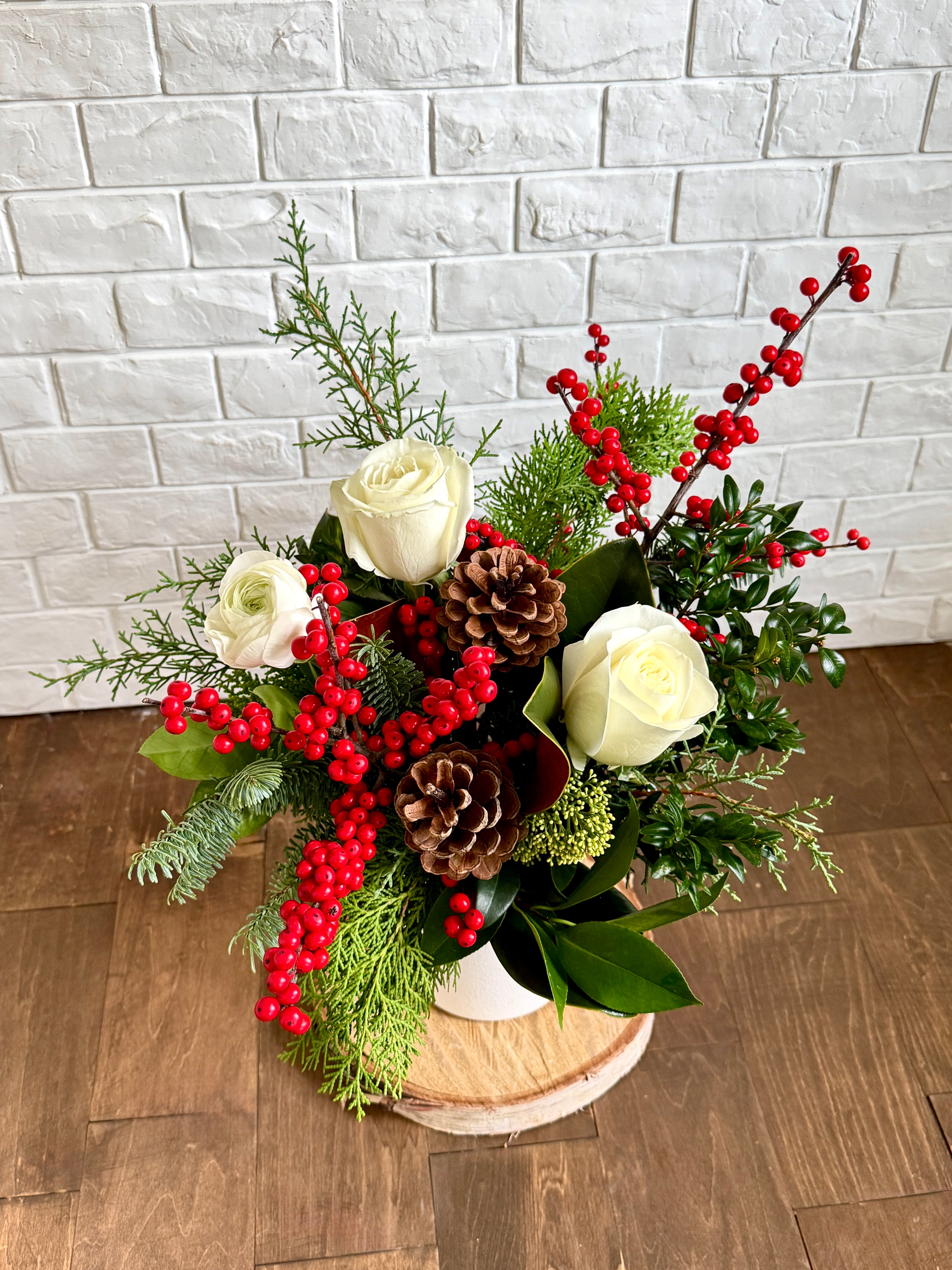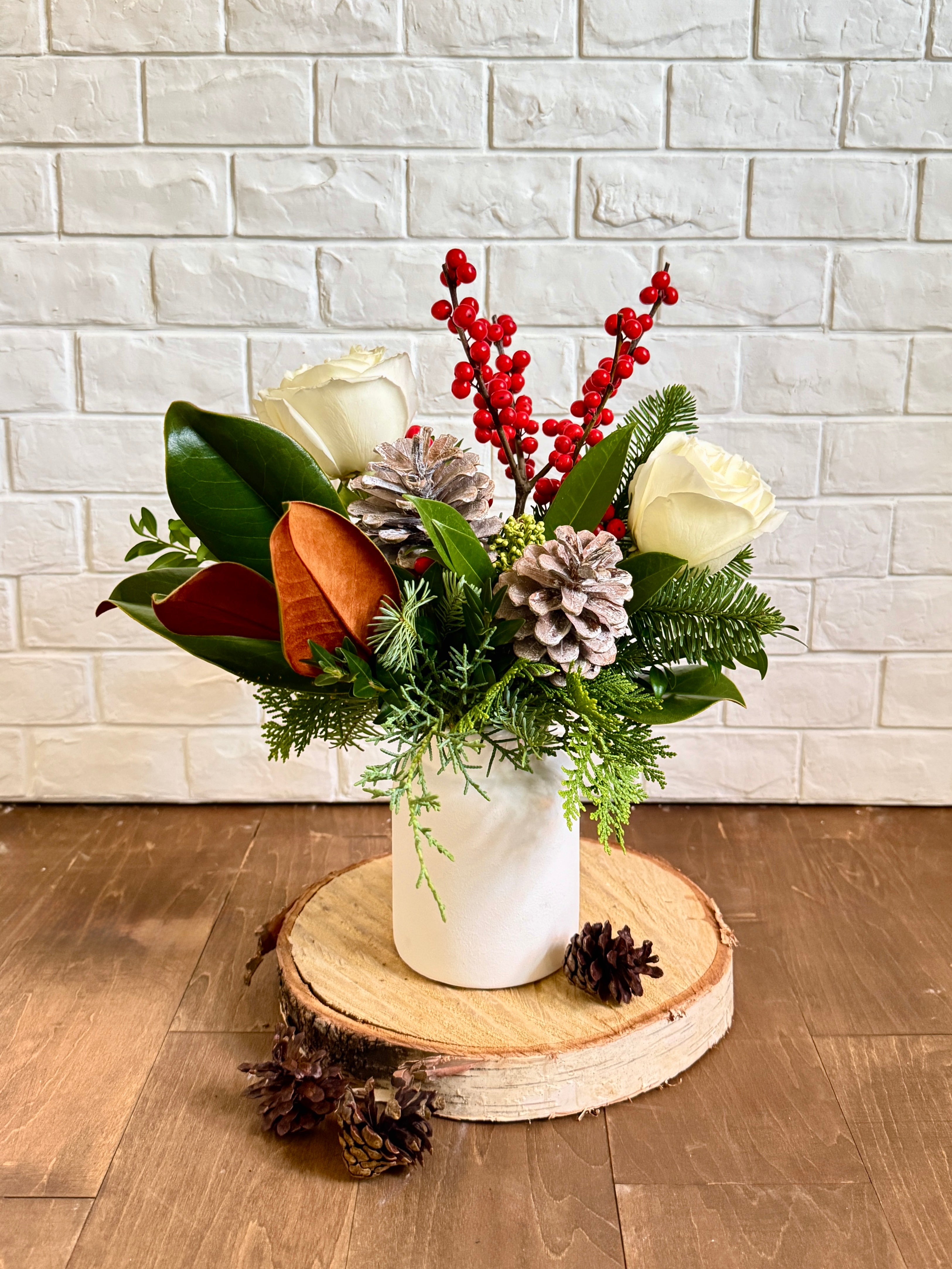 A cozy winter arrangement that blends crisp whites, festive berries and natural woodland textures. Warm, classic Christmas details come together in a soft, refined style - perfect to add to you holiday party decor or as a hostess gift.